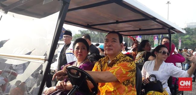 Jakarta, CNN Indonesia -- Ketua Umum Partai Berkarya Tommy Soeharto tampak santai mengendarai mobil golf untuk ikut acara deklarasi Kampanye Damai yang digelar di Monas, Jakarta Pusat, pagi ini, Minggu (23/9).Tommy menumpangi mobil tersebut ini bersama dengan keluarga cendana lainnya. Di sampingnya duduk saudara perempuannya yang juga mantan istri calon presiden Prabowo Subianto Titiek Soeharto.
