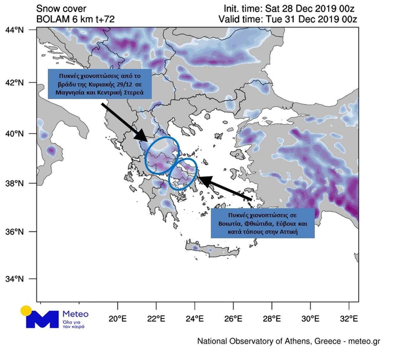 γ. Χιονοπτώσεις κατά περιόδους πυκνές θα εκδηλώνονται σε ορεινές και ημιορεινές περιοχές καθώς και σε περιοχές με χαμηλότερο υψόμετρο (200-400m) της Θεσσαλίας, της ανατολικής Στερεάς και της Εύβοιας. Επίσης χιονοπτώσεις θα εκδηλωθούν στα ορεινά και ημιορεινά της βορειοανατολικής Πελοποννήσου, της Κρήτης, των Σποράδων, των νησιών του βόρειου και ανατολικού Αιγαίου και πιθανώς στις βόρειες Κυκλάδες.