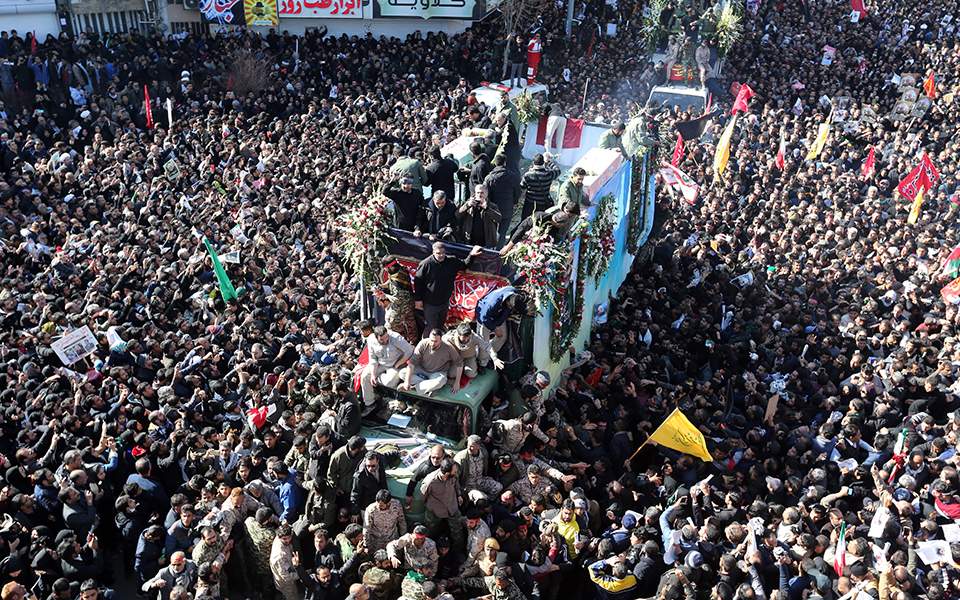 Στο κέντρο της πόλης Κερμάν, της γενέτειρας του ιρανού στρατηγού, ο οποίος επρόκειτο να ενταφιασθεί το απόγευμα, πυκνό πλήθος, όπως και τις δύο προηγούμενες ημέρες στην Τεχεράνη και στις άλλες ιρανικές πόλεις, είχε συρρεύσει για να ξεπροβοδίσει τον ισχυρό άνδρα του Ιράν που σκοτώθηκε από αμερικανικό πλήγμα την Παρασκευή στην Βαγδάτη.