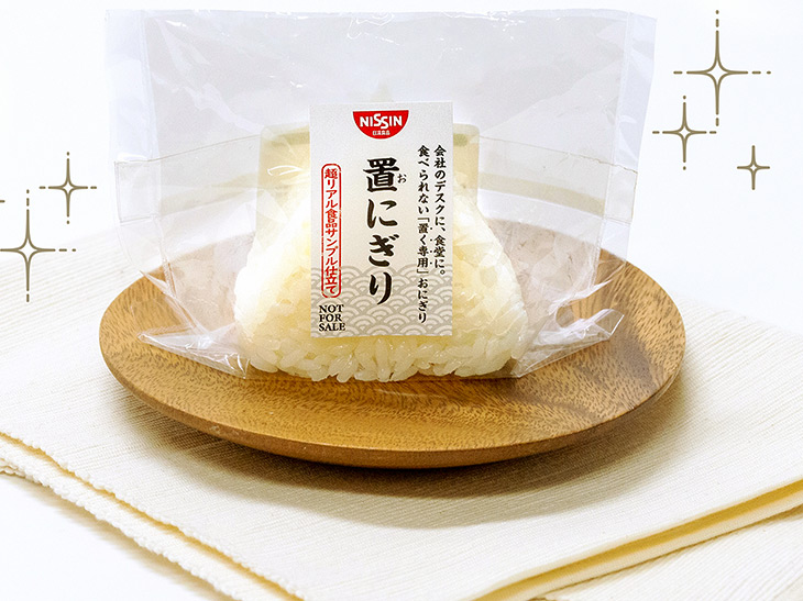 そんな周囲の面倒な視線や言葉を一網打尽にするアイテムが、前代未聞の「置(お)にぎり」なんです。「何、それ?」と思う人が多いでしょう。実は、日清食品株式会社の作った“置く専用のおにぎり”。いわゆる精巧な食品サンプルです。もちろん食べられないのですが、本物そっくりなので、ただ置いておくだけで、周囲をしっかり騙せます。