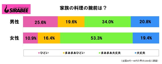 ちなみに、しらべぇ編集部が全国の20~60代の男女1,354名を対象に「家族の料理の腕前」について調査したところ、全体の27.0%の人が否定的な回答をしている。