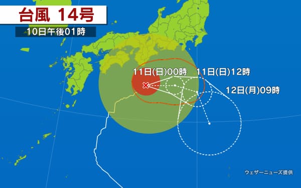 台風は11日朝にかけて伊豆諸島南部に最も近づく見通し。その後は勢力を弱めながら、進路を南寄りに変え、12日朝には熱帯低気圧に変わるとみられる。