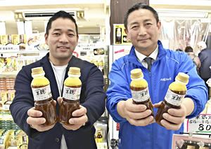 同町の道の駅かわまたの敷地内にある「銘品館シルクピア」でお披露目と鍋の試食会を開き、振興公社の渡辺良一専務と小田原屋の芝田机太郎(きたろう)社長らが商品をPRした。銘品館シルクピア、セレクトショップ「AMEKAZE」(郡山市、三春町)で販売している。1本800円。渡辺専務は「川俣シャモのおいしさを広く知ってもらう新たなきっかけにしたい」と話した。