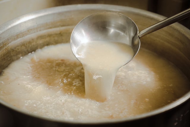 汁あり担々宮古そばに使用するスープは、めんば〜るのスープ職人が心をこめて炊き上げたもの。味のしつこさや、くどさなどは一切排除し、濃厚だけどスッキリしたおいしさに仕上がっています。沖縄県産の豚骨と鶏ガラをコトコト煮込むこと5〜6時間。丁寧にアクを取り除いたスープは、白濁しているもののとても澄んでいて、通常のスープのように背脂が浮くことなく、すべてがきれいに乳化されています。
