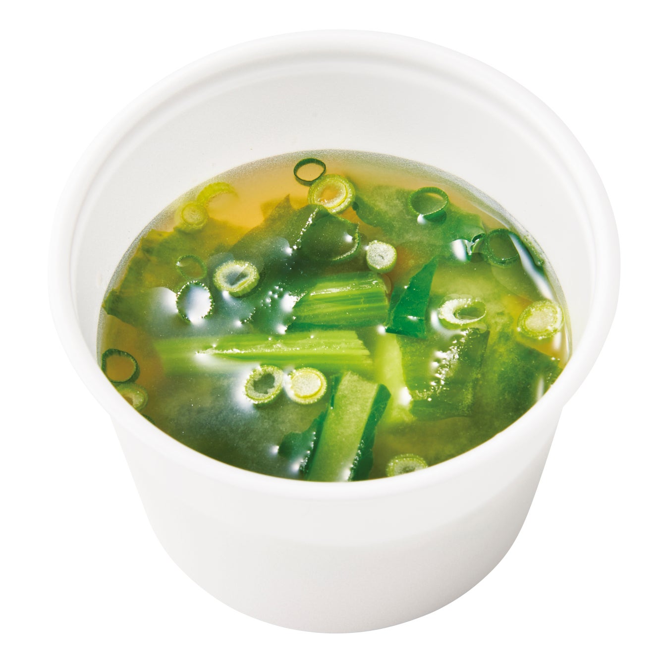 具材はわかめと小松菜を入れて野菜感をアップしました。味噌汁は、信州みそを採用し、かつおと昆布だしを効かせてコクと旨味が味わえる仕立てです。いつものお弁当に野菜をプラスしたいときにおすすめです。