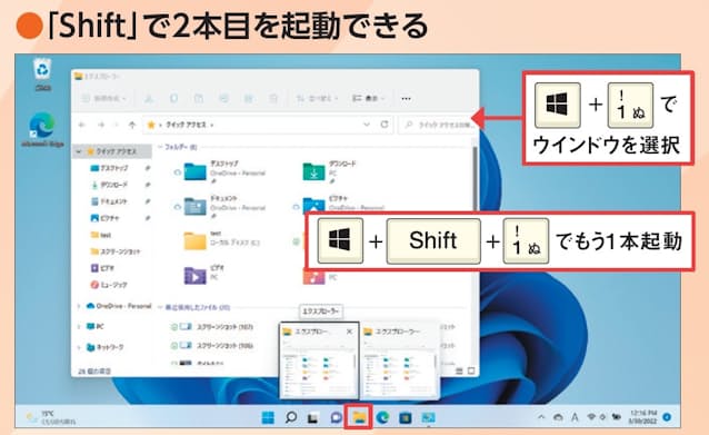 図3 すでにウインドウが開いている場合、図2のキー操作(この例はエクスプローラーが「1」)ではそのウインドウに切り替わるだけだが、「Shift」キーを組み合わせると2本目以降を起動できる。複数のエクスプローラーを開きたいときなどに便利