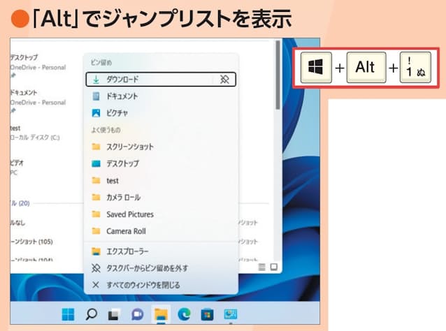 図4 「Alt」キーを組み合わせると、そのアプリのジャンプリストが開く(この例はエクスプローラーが「1」)。よく使うファイルや履歴などに素早くアクセスできる「設定」画面をよく使うベテランには、それを一発で開く「Windows」+「I」キーをぜひお薦めしたい(図5)。スタートメニューから選ぶより断然素早い。ゴロ合わせで「Information」の「I」などと覚えておこう。