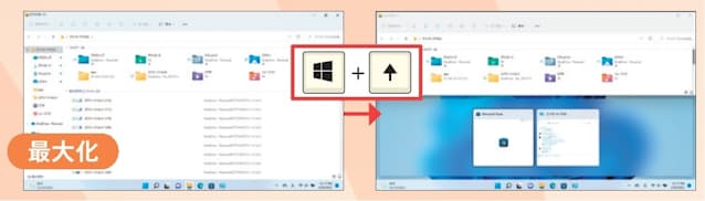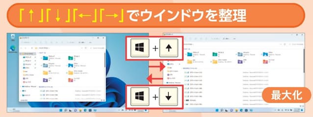 「Windows」キーではウインドウのスナップ操作もできる。「↑」「↓」および「←」「→」はセットで覚える。