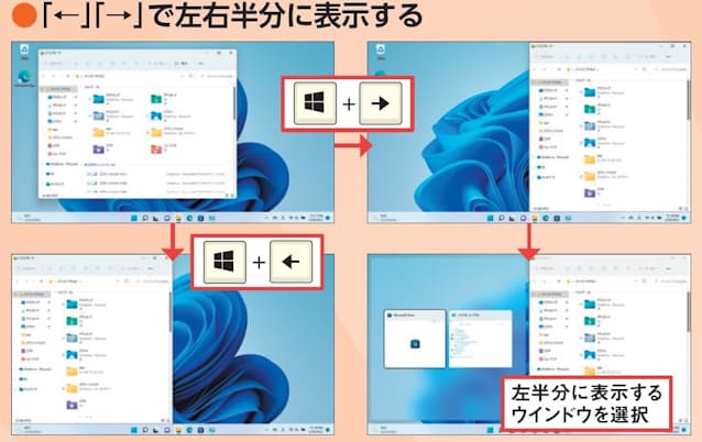図11 「Windows」キーを押しながら「←」「→」キーを押すと、現在のウインドウを画面の左もしくは右半分ぴったりに表示する。「Windows」キーを離すと反対側に表示するウインドウを選択できるからの記事と詳細 ( 「Windows」キーとの合体で、便利な「万能キー」に|NIKKEI STYLE - Nikkei.com )